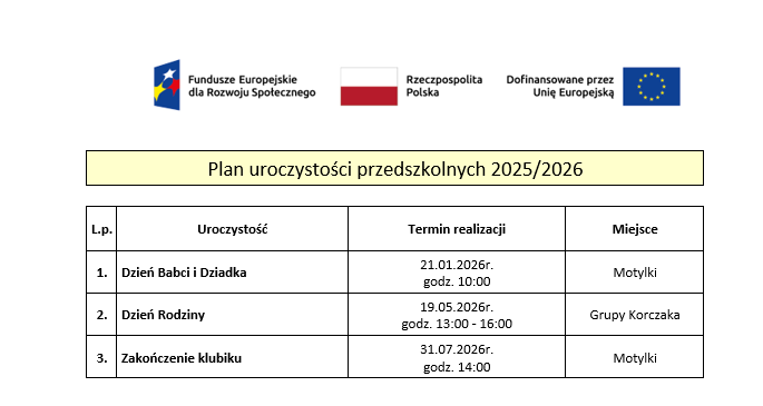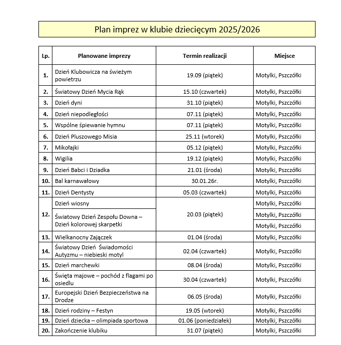Plan Uroczystości i Imprez Klub Dziecięcy 2025/2026